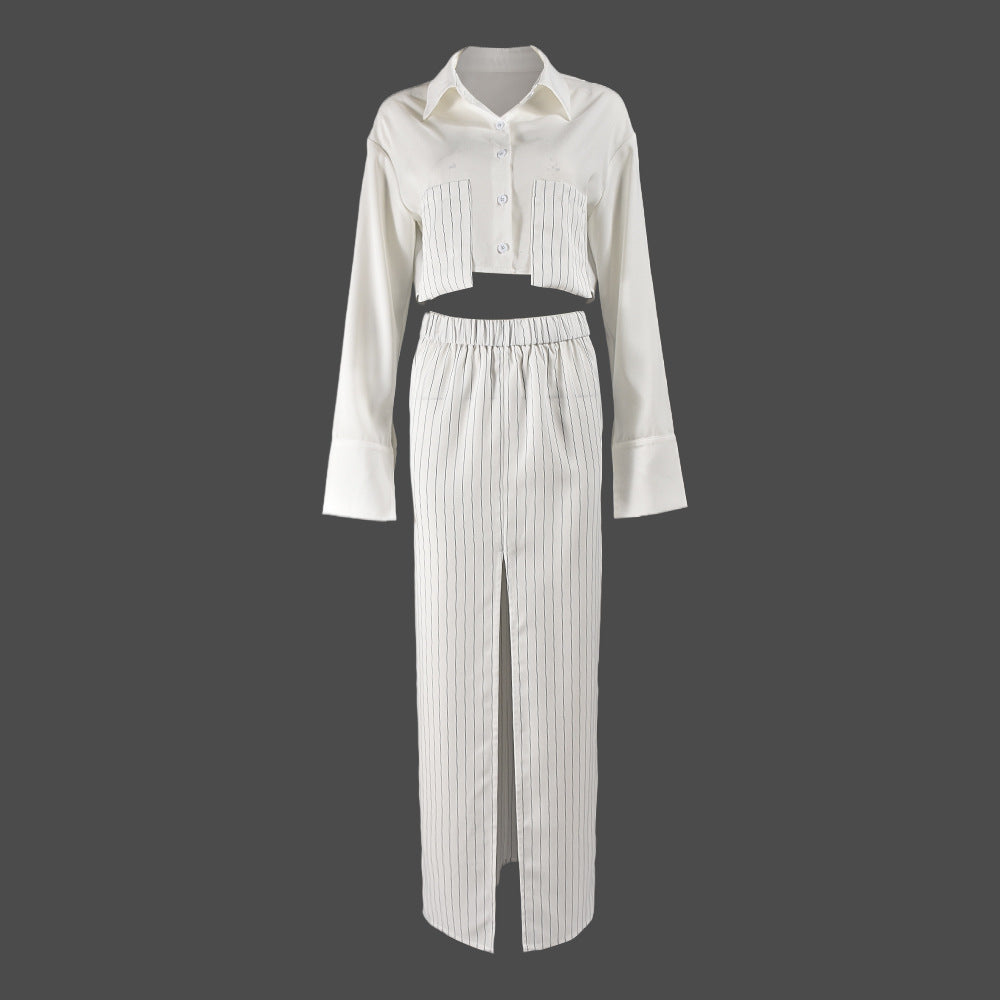 Autumn And Winter Women's Shirt Midriff-baring Long Sleeve Top Elastic Waist Skirt Suit