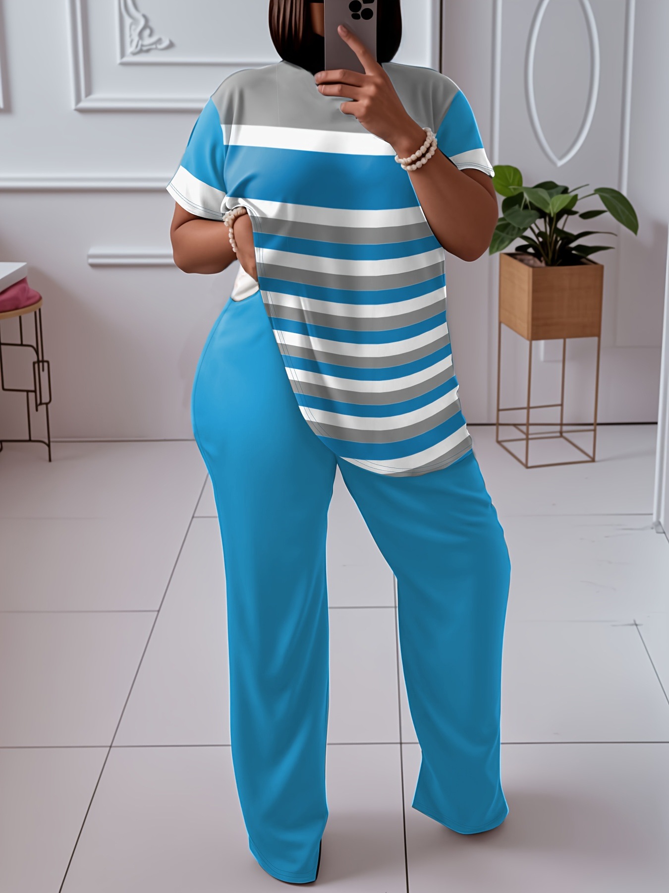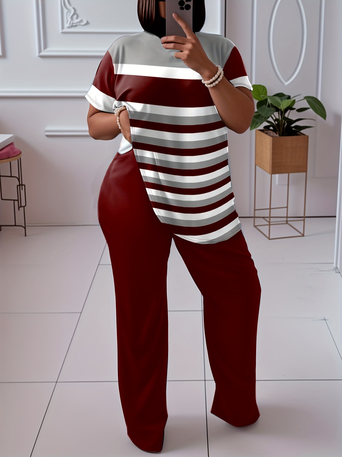 Contrast Color Striped Short Sleeve With Wine Red Wide Leg Pants Fashion Suit