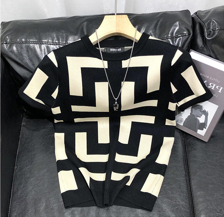 Geometric Pattern Bottoming Shirt Men's Short-sleeved Knitted Top