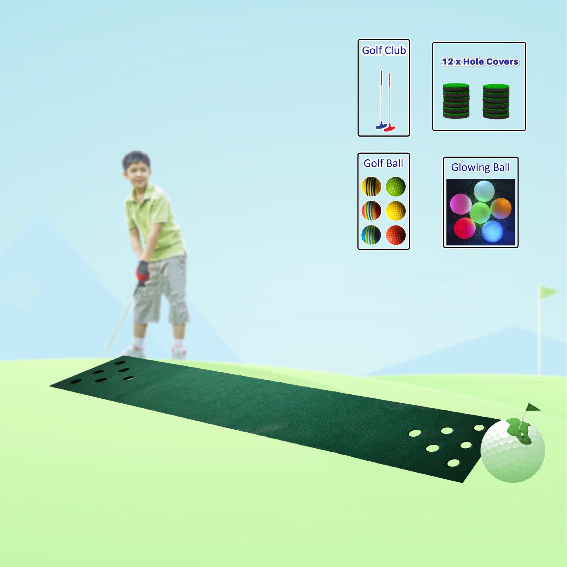 Material: Double head slope + 5mm high foam bottom + 10mmPP grass + 12 holes + club