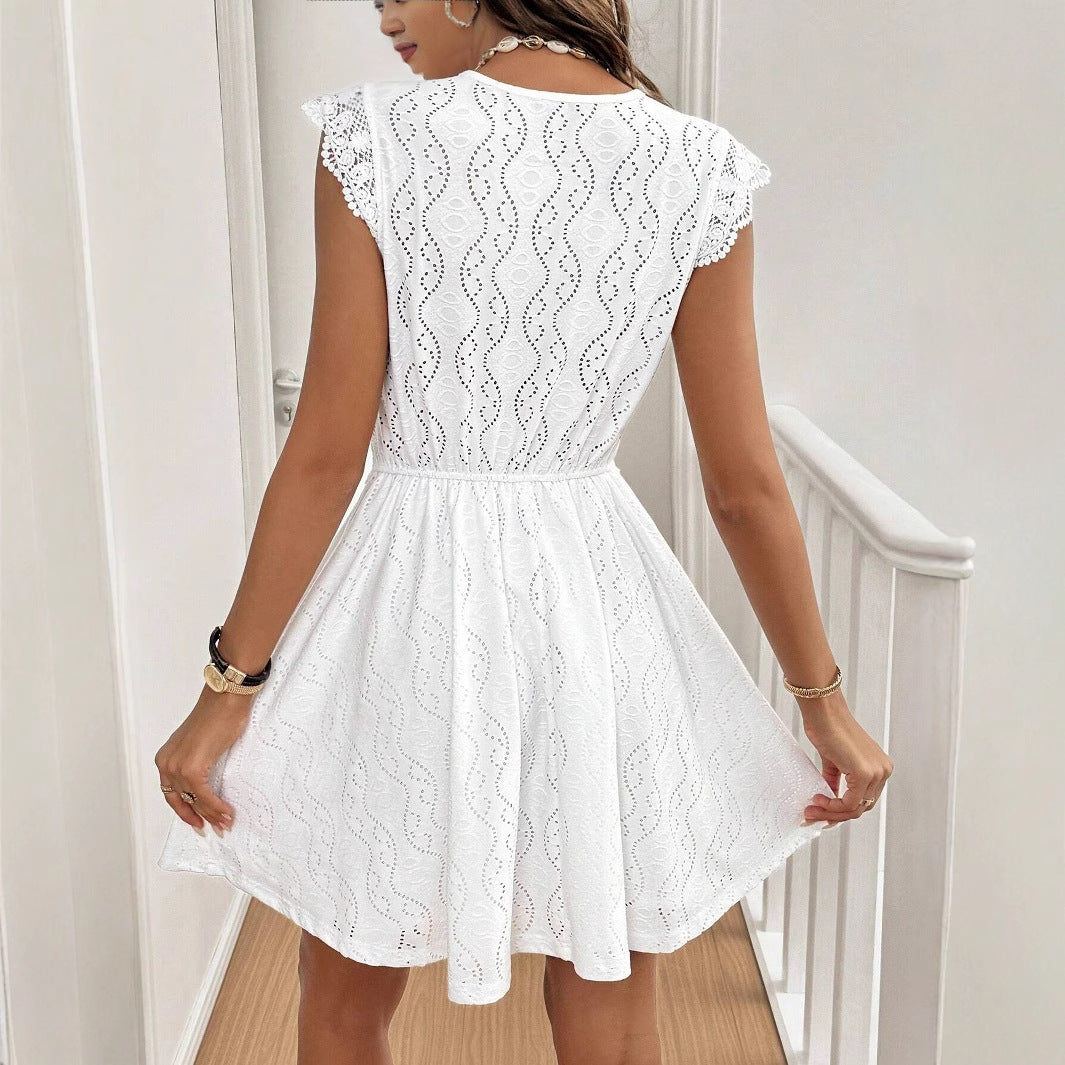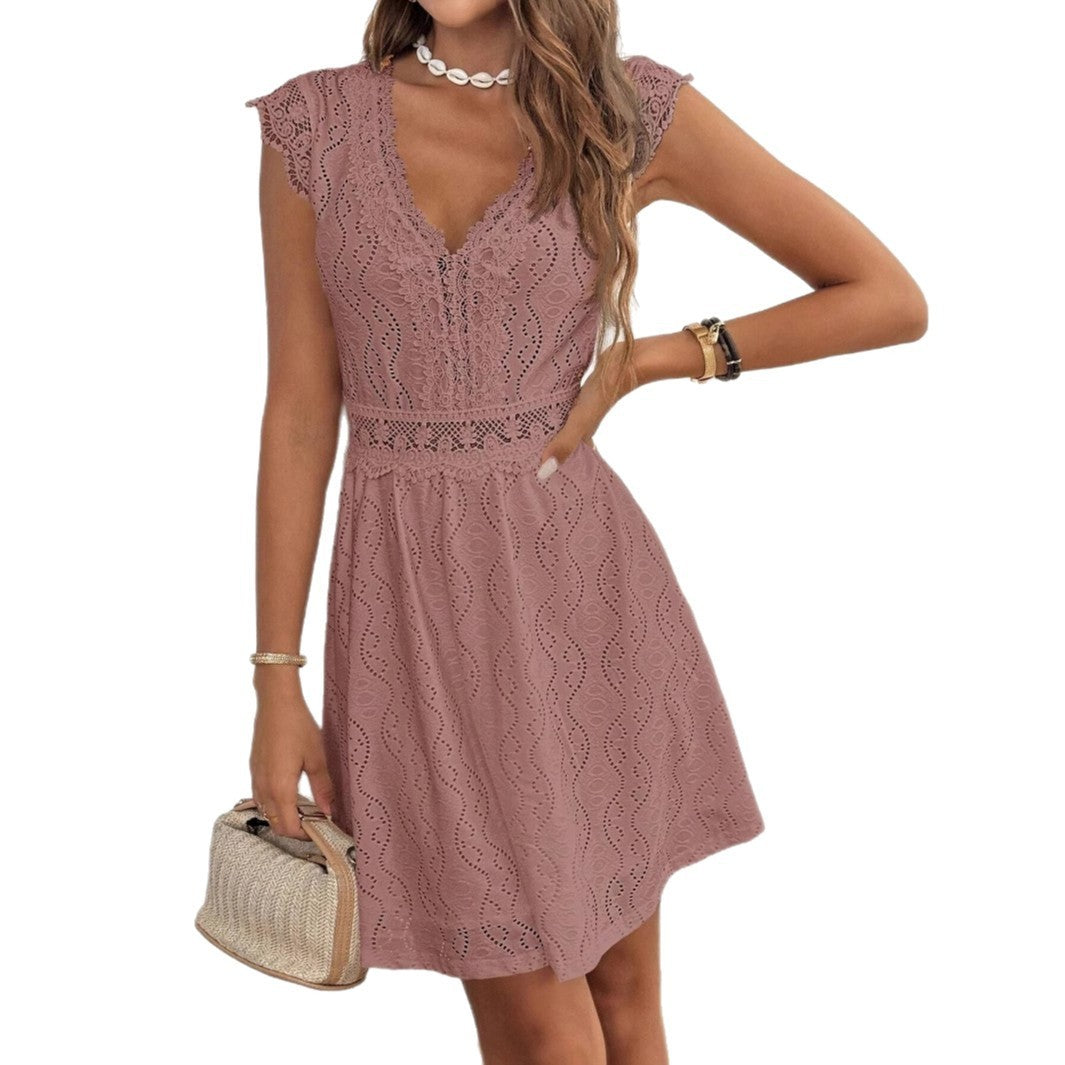 Knitted Jacquard Hollow Out V-neck Stretch Lace Skirt Dress