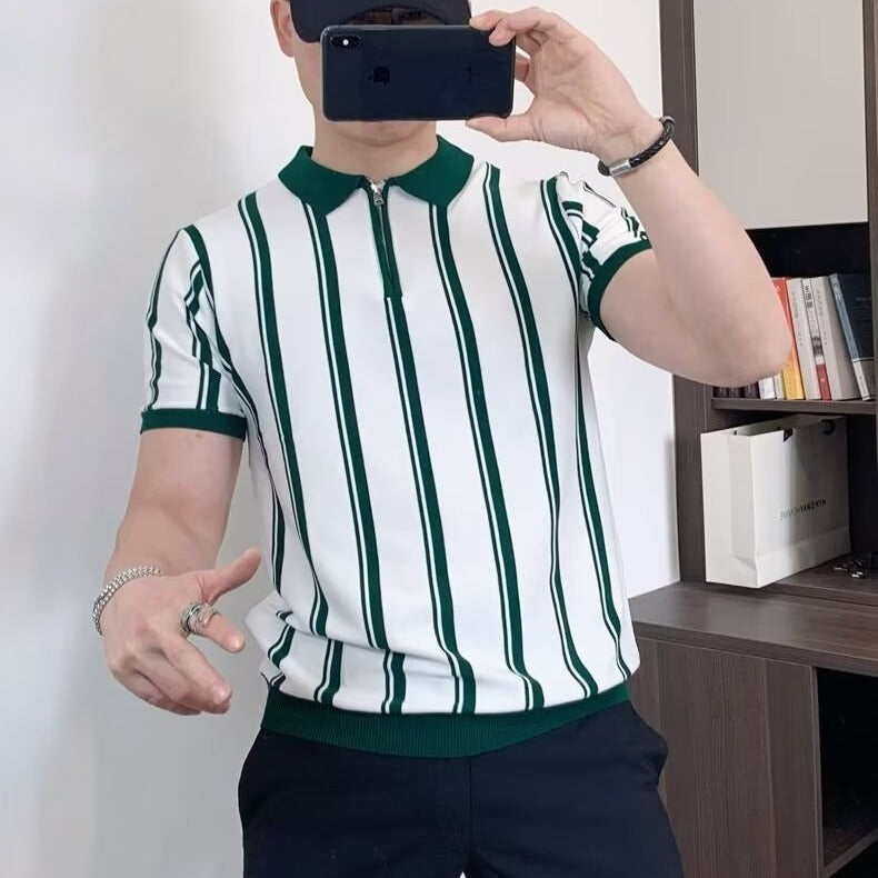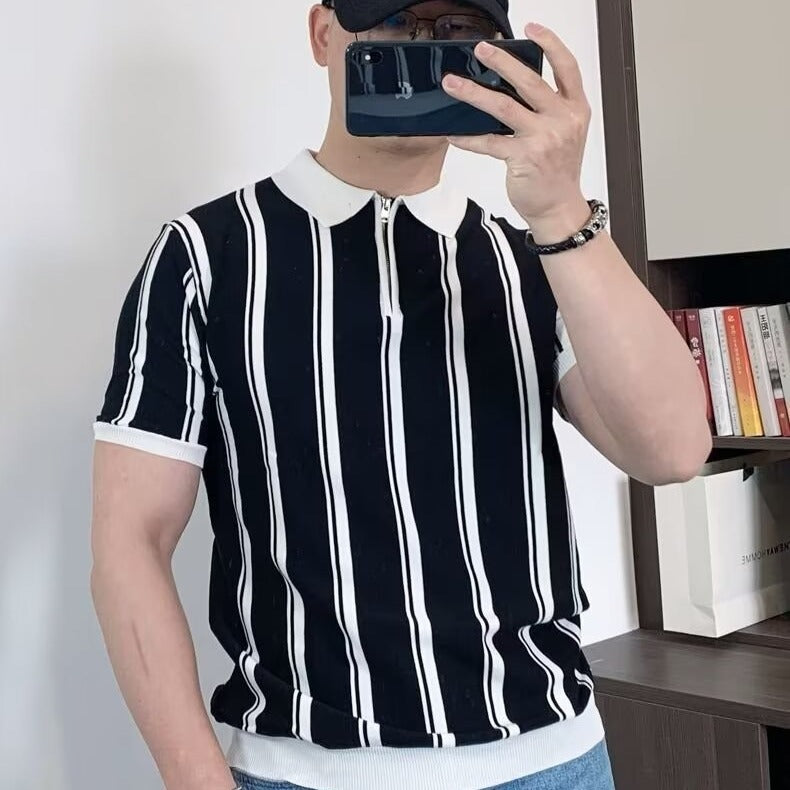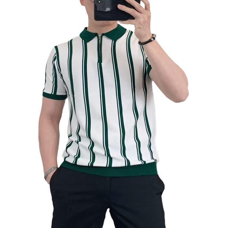 Korean Style Vintage Stripe Personality Zipper Half-sleeved Casual T-shirt For Men