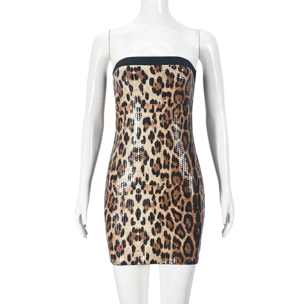 Leopard Print Women's Color Matching Double Layer Tube Dress Sequin Hip Bag Dress