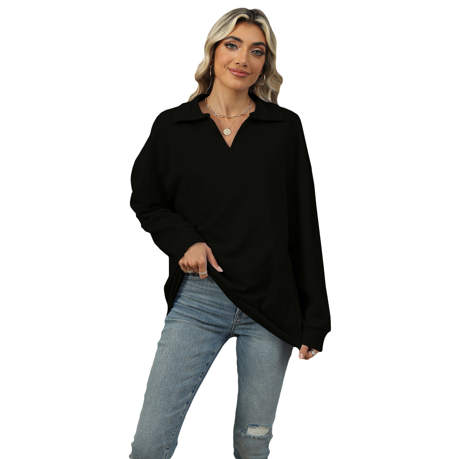 New Lapel V-neck Sweatshirt Fashion Casual Loose Solid Color Long-sleeved Pullover Top For Womens Clothing