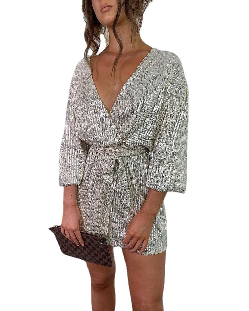Sequin Belt Open Access Control Deep V-neck Dress