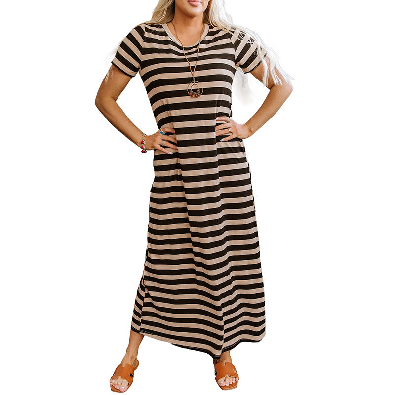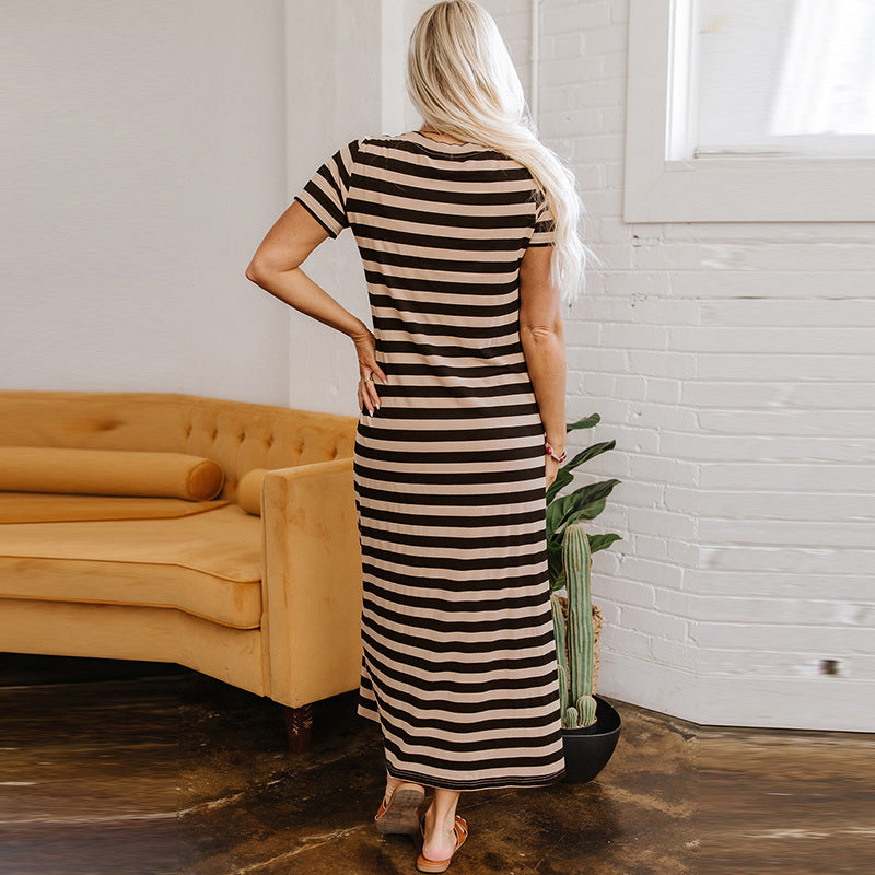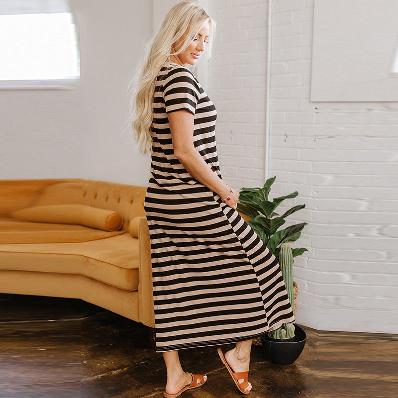 Spring And Summer Pullover Crew Neck Casual Style Striped Print Dress Women