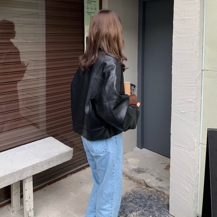 Spring Niche Handsome Lapel Single-Breasted Loose Casual Long-Sleeved Motorcycle Clothing Leather Short Jacket Women