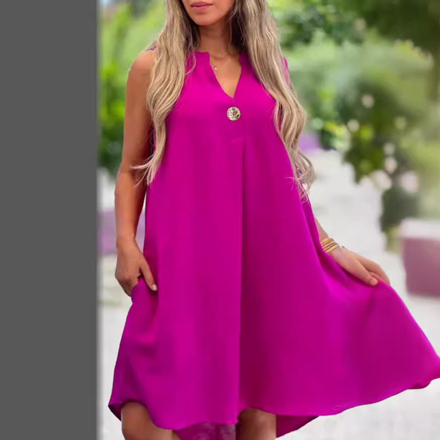 Summer V-neck Sleeveless Dress With Button Decoration Solid Color Casual Loose Straight Dresses Womens Clothing