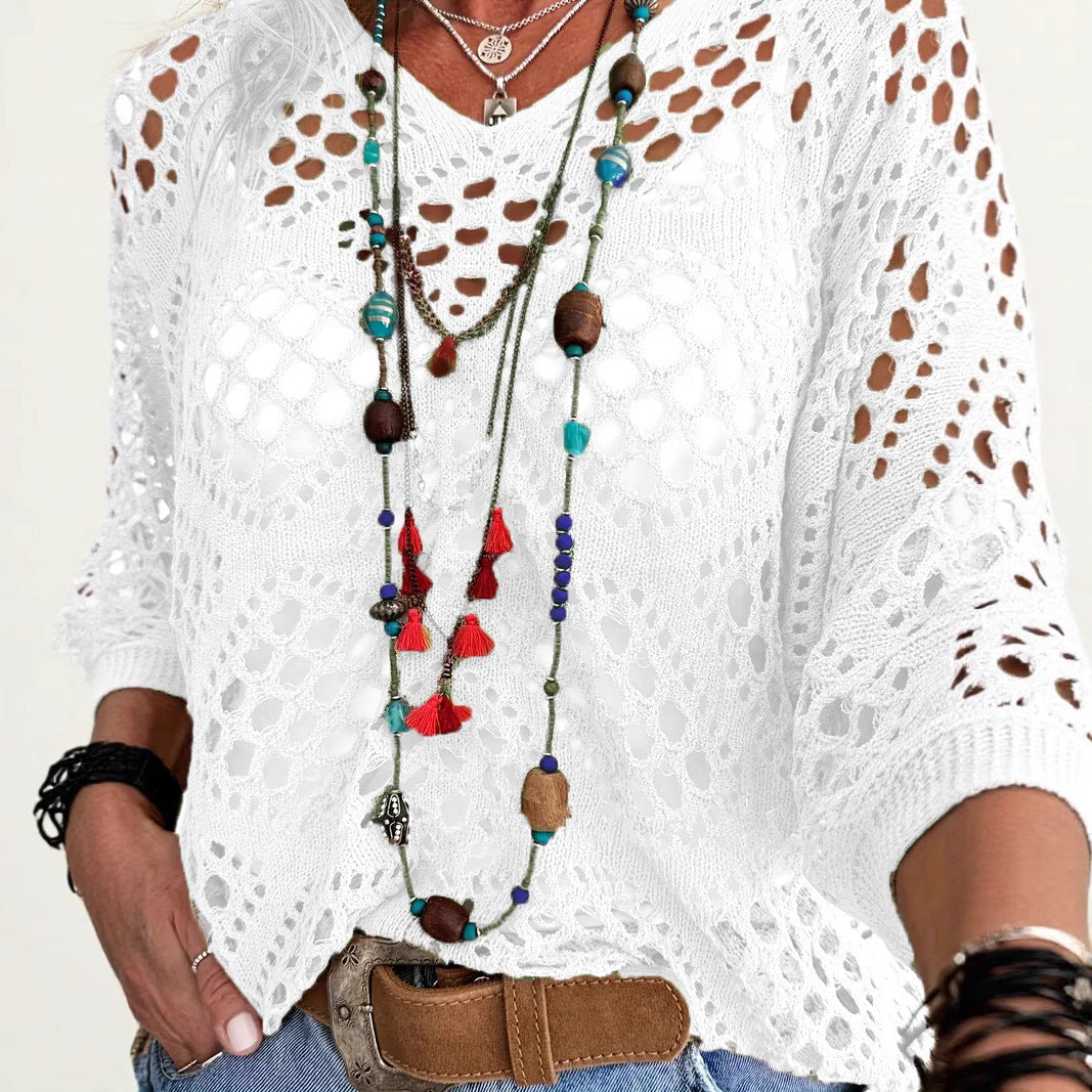V-neck Diamond Hollow Bat Sleeve Women's Sweater