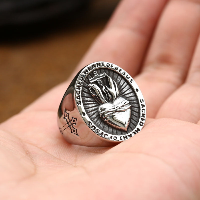 Vintage Dropshipping Stainless Steel Ladies Mens Biker Punk Sacred Heart Of Jesus God Ring Cross Amulet Jewelry For Man Gift